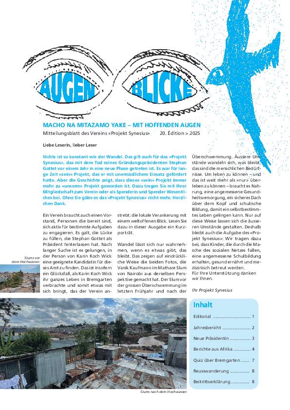 Über Ihre Spenden würden wir uns – zusammen mit den Benachteiligten in Afrika – herzlich freuen (Spendenkonto: PC 50-6-9 Aarg. Kantonalbank Aarau, z.G. Aarg. Kantonalbank Wohlen IBAN: CH79 0076 1016 1013 3892 1. Vermerk: PROJEKT SYNESIUS BREMGARTEN, Emmaus Eye Clinic)